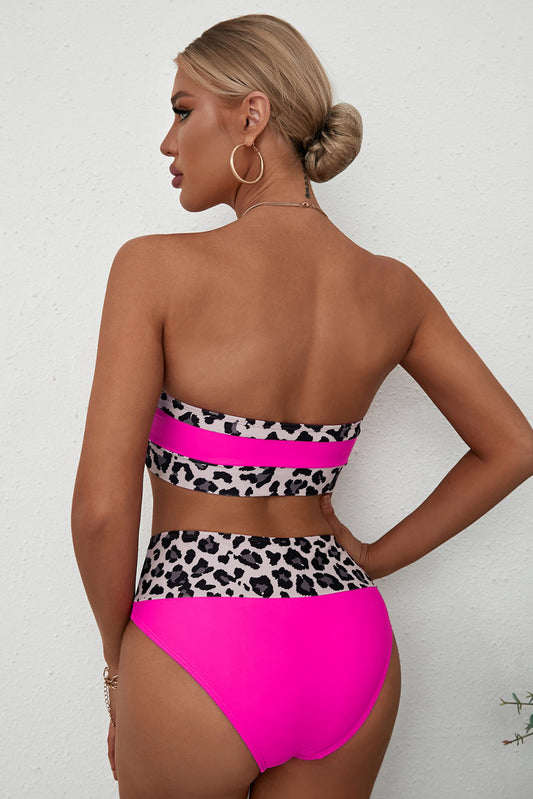 Neon Pink Sexy Leopard Print Trim Bandeau Bikini