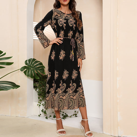 Vestido a media pierna con cuello redondo y lazo en la cintura de Paisley
