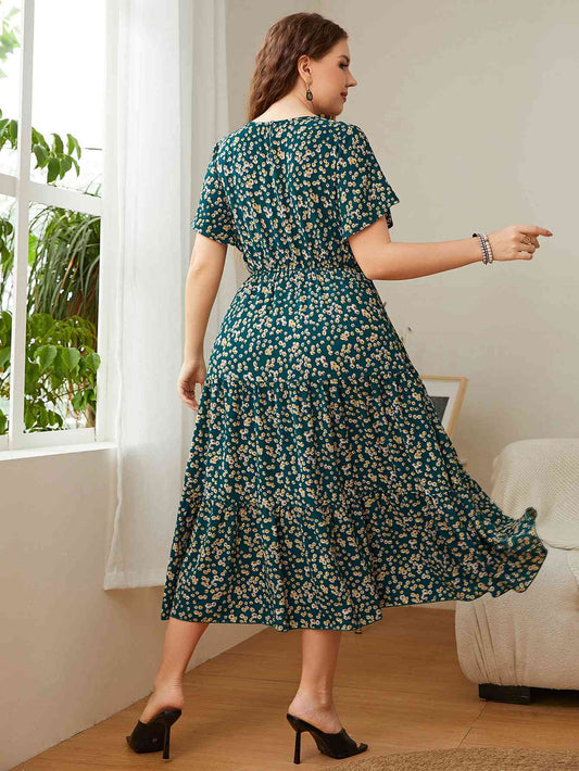 Plus Size Floral Round Neck Short Sleeve Midi Dress