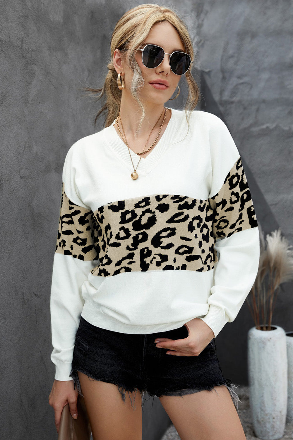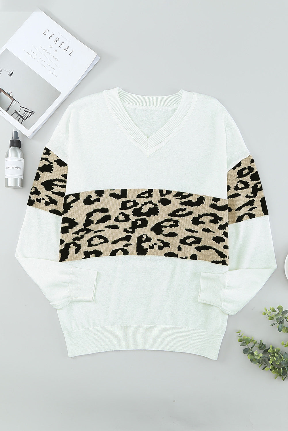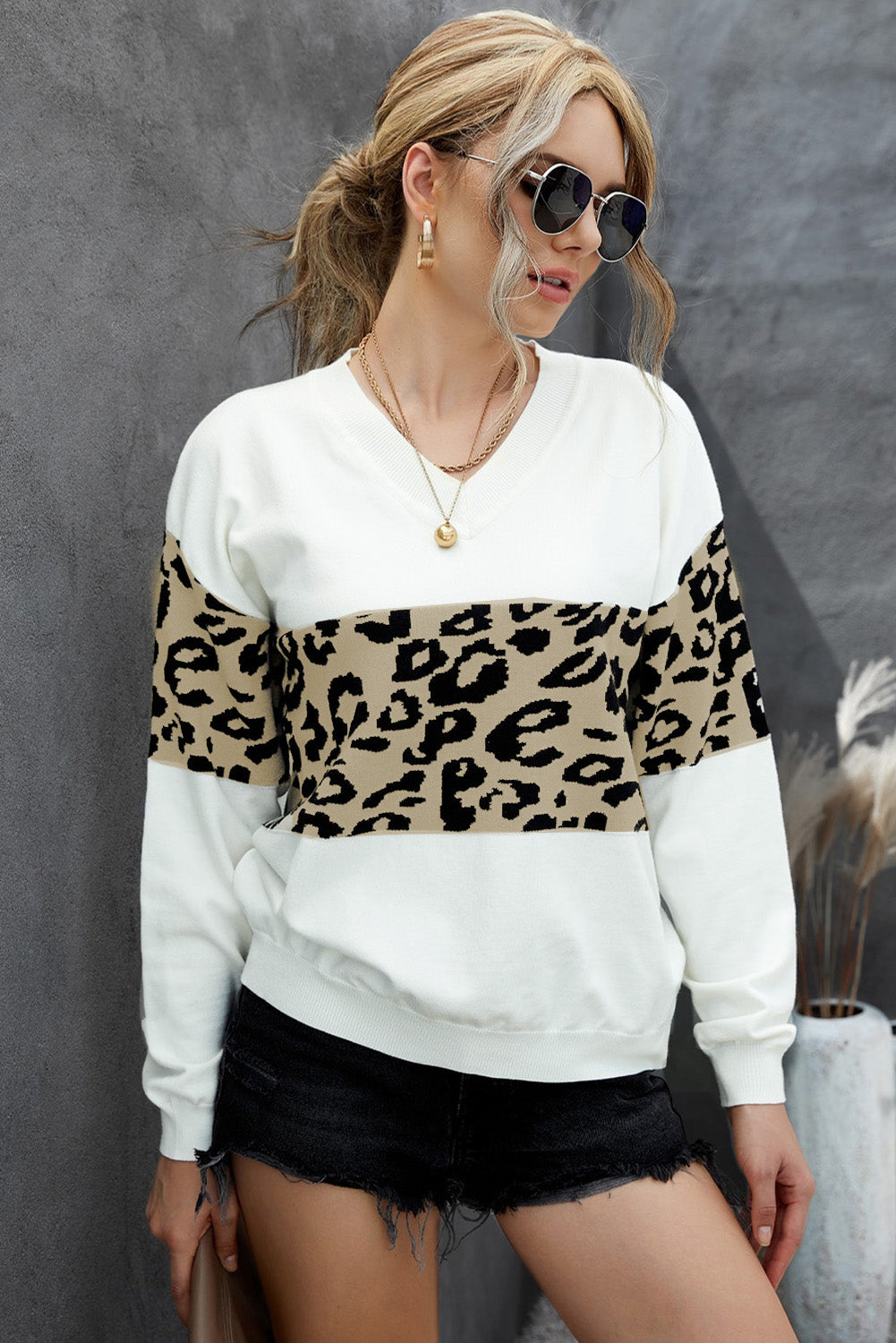 Leopard Drop Shoulder V-Neck Knit Top