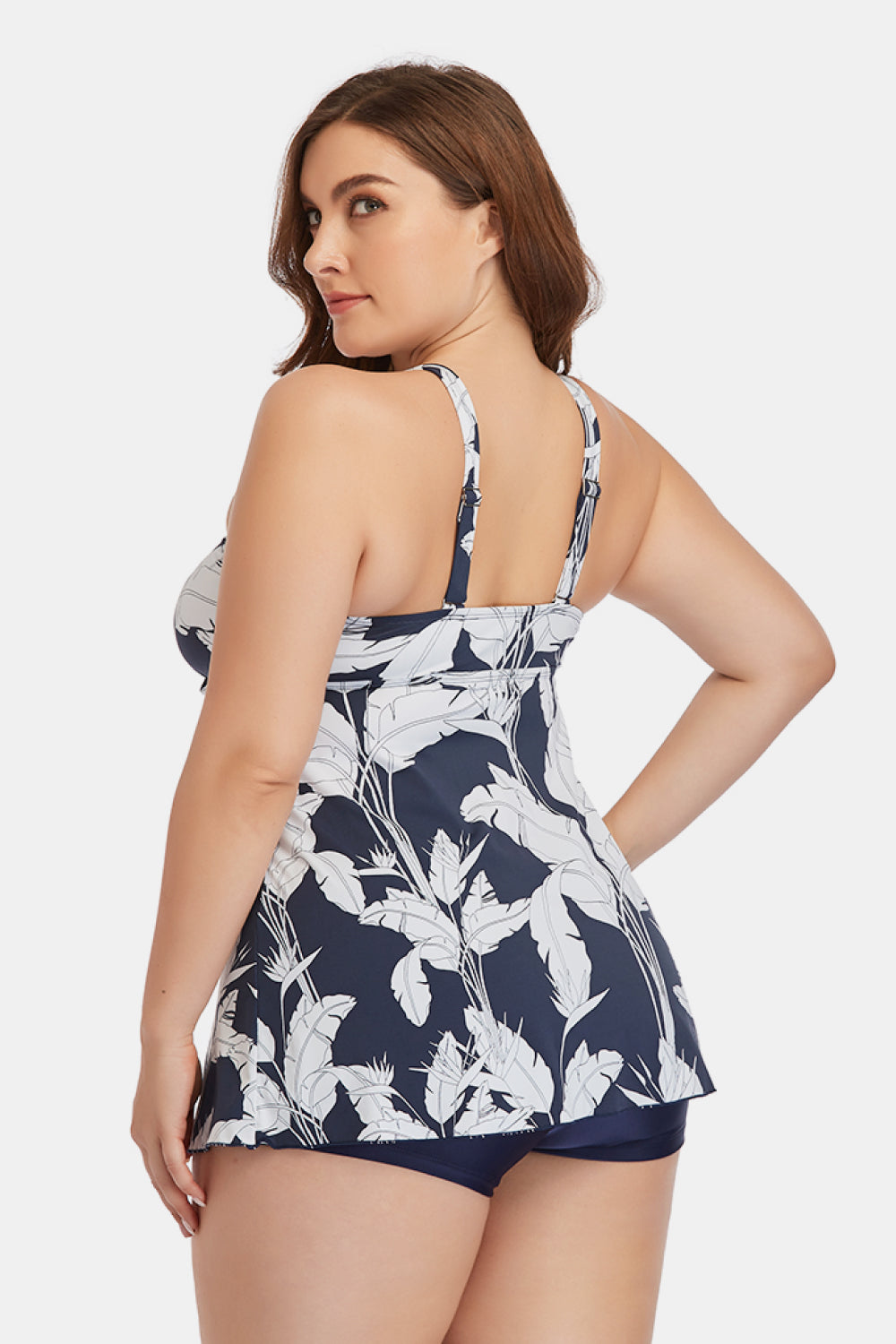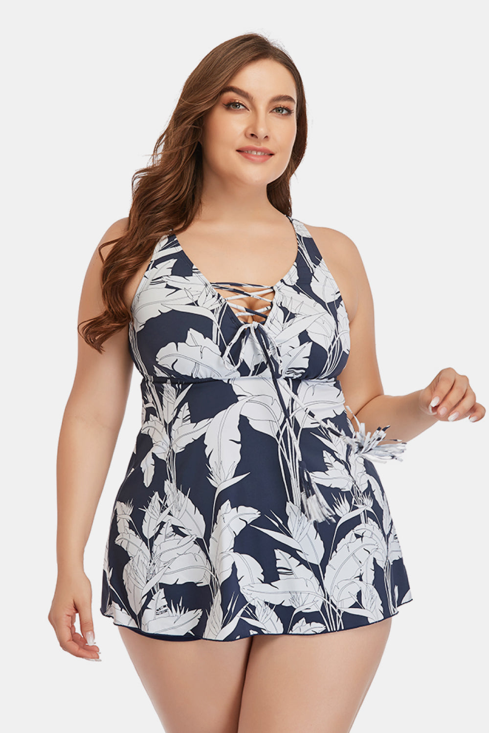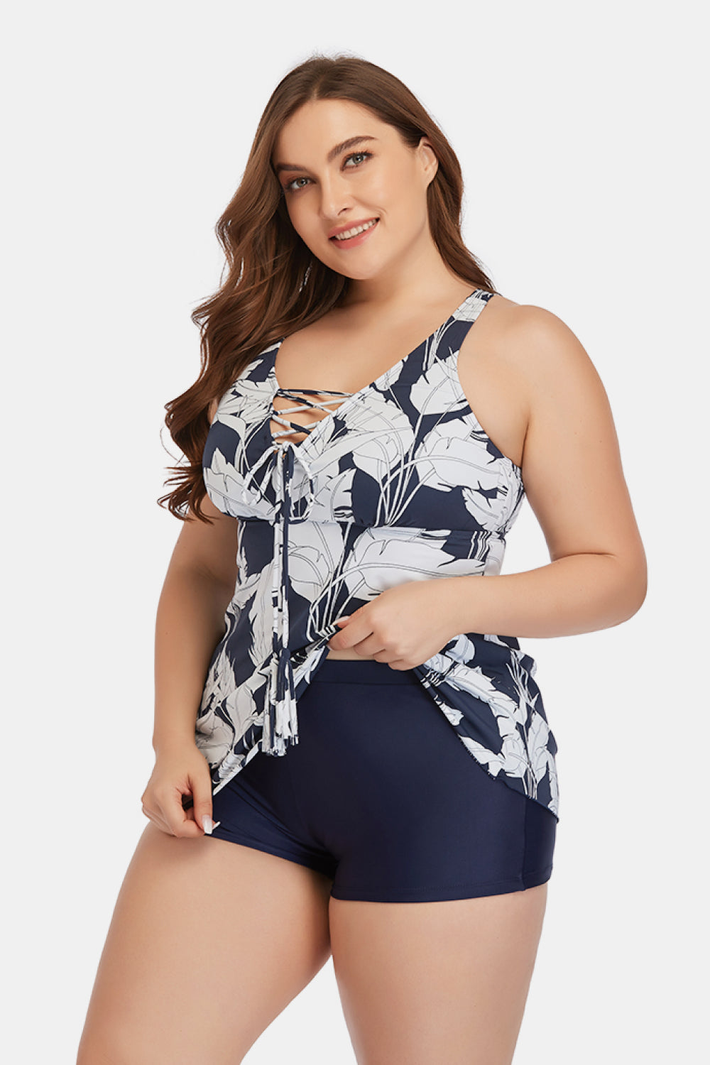 Plus Size Botanical Print Lace-Up Two-Piece Swim Set
