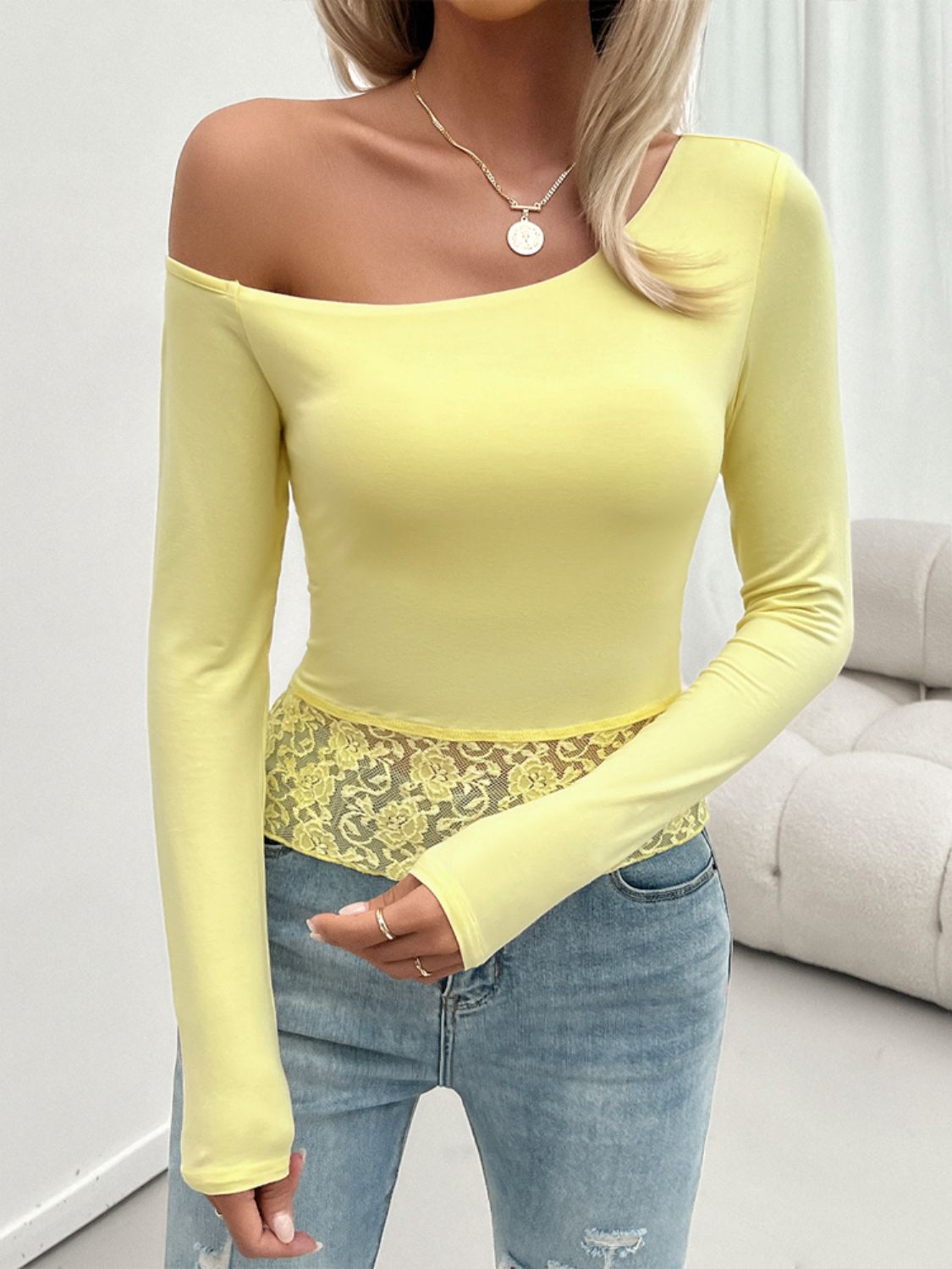 Single Shoulder Long Sleeve Lace T-Shirt